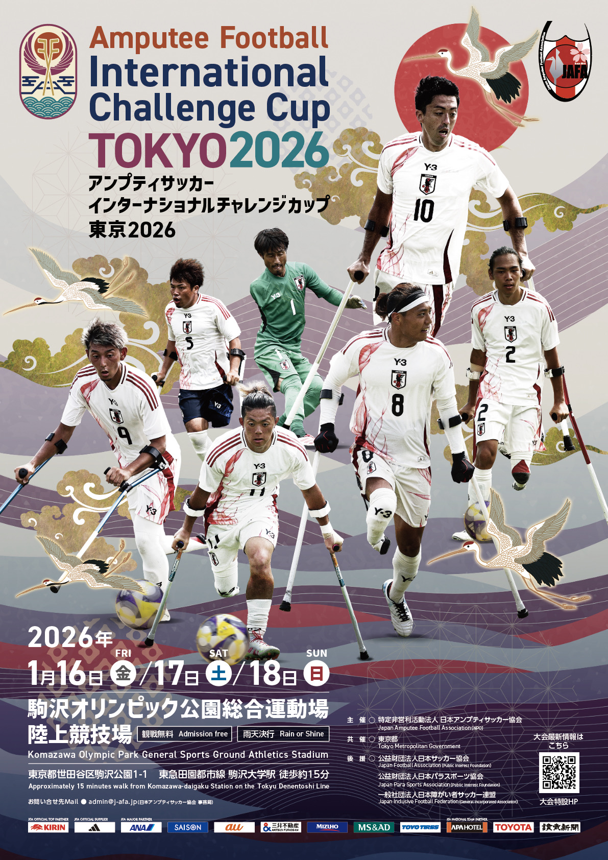 2026年1月16日(金)から1月18日(日)にかけて、駒沢オリンピック公園総合運動場 陸上競技場(東京都)で行われる「Amputee Football International Challenge Cup -Tokyo 2026-」では、以下のとおり試合のライブ配信を行う予定です。
